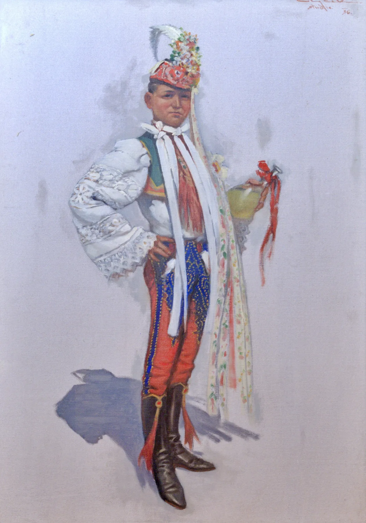 Velmi precizně zachycený dobový stav (meziválečné období) slavnostního kroje pro svobodného chlapce z jižního Podluží. Konkrétně z obce Lanžhot. Červené soukenné kalhoty „červenice“ zdobí modré „šňůrování“, jemné „cifrování“ a drobná žlutá výšivka. Hlavním vzorem výšivky na stehnech jsou typická lanžhotská srdíčka, po lanžhotsku je i do kapes kalhot vložený vyšívaný kapesníček. Rukávy sváteční košile „katrovice“ mají tři vložené formy bílé výšivky a jsou ukončeny širokou, paličkovanou „vláčkovou čipkou“ (krajkou).