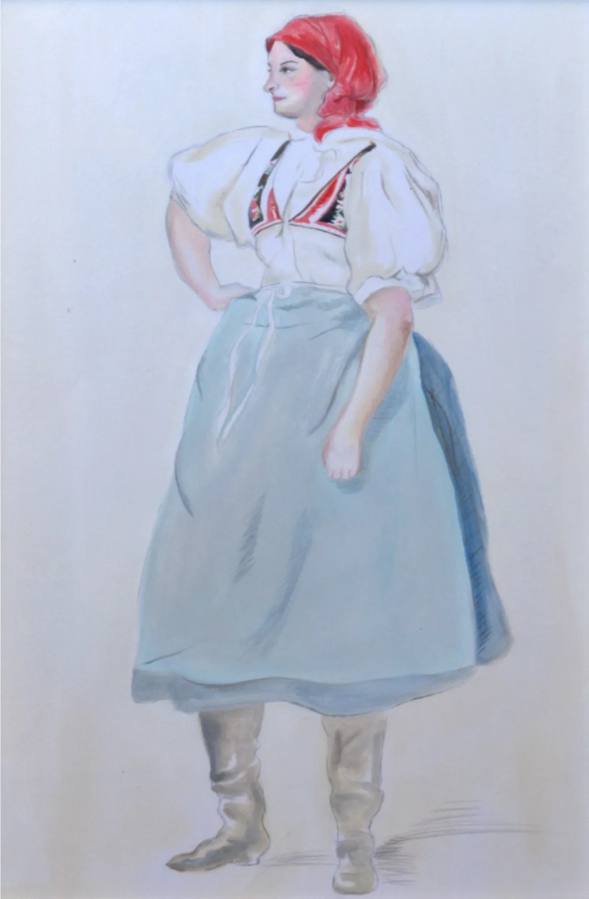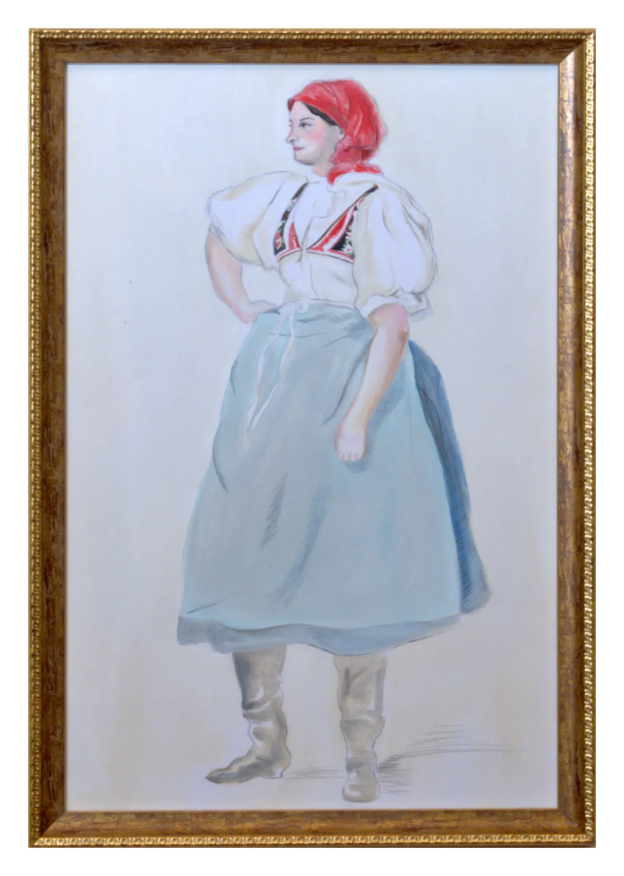 Modelem pro tento obraz stála Mánesovi v roce 1954 Tereza Kobzíková ze Staré Břeclavi. Barevně nejvýraznější krojovou součástí je jasně červený šátek, uvázaný dle dobového způsobu na „drndu“. Plátěné rukávce s krátkými „taclemi“ bez výšivky a krajky nám dokládají, že jde o každodenní lidový oděv. Velký obdélníkový „obojek“ je ještě pevnou součástí rukávců a pod krkem uvázaný bílými šňůrkami. Největší změnou oproti živůtkům z první poloviny 19. století je hluboce vykrojený „lajbl“ s již zapínáním na jeden spodní knoflík (mizí typické šněrování s kořeny na konci 18. století). Svrchní sukně je délky lehce pod kolena, modravé barvy a doplněna nezbytnou zástěrou pastelového odstínu. Černé čižmy jsou volně navrapené.