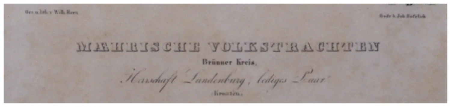 Vyobrazení dívčího kroje je dle autora v pastelových barvách, které doplňuje výrazná tmavě fialová barva hedvábné zástěry. Živůtek má již oblíbenou barevnou kombinaci růžové a bledě modré, ale stále používá šněrování. Růžové, fialové a žluté stuhy zdobí kroj na třech místech – pod krkem, kolem pasu a na lepenkovém čepci a tak to zůstane až do současnosti. Jen se bude proměňovat šíře, materiál a barevnost mašlí. Na kroji najdeme i černou výšivku, zdobící límec rukávců „obojek“.