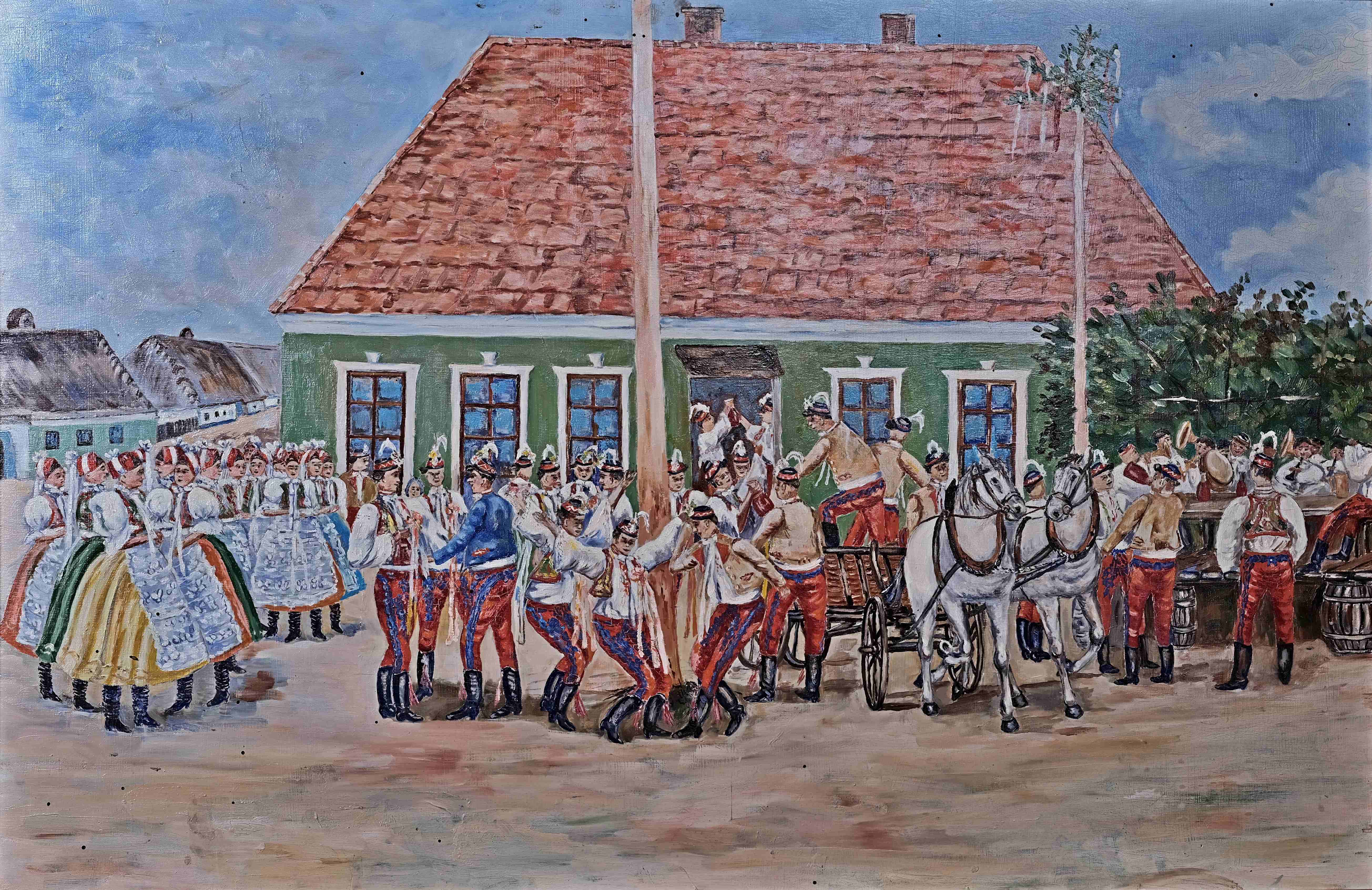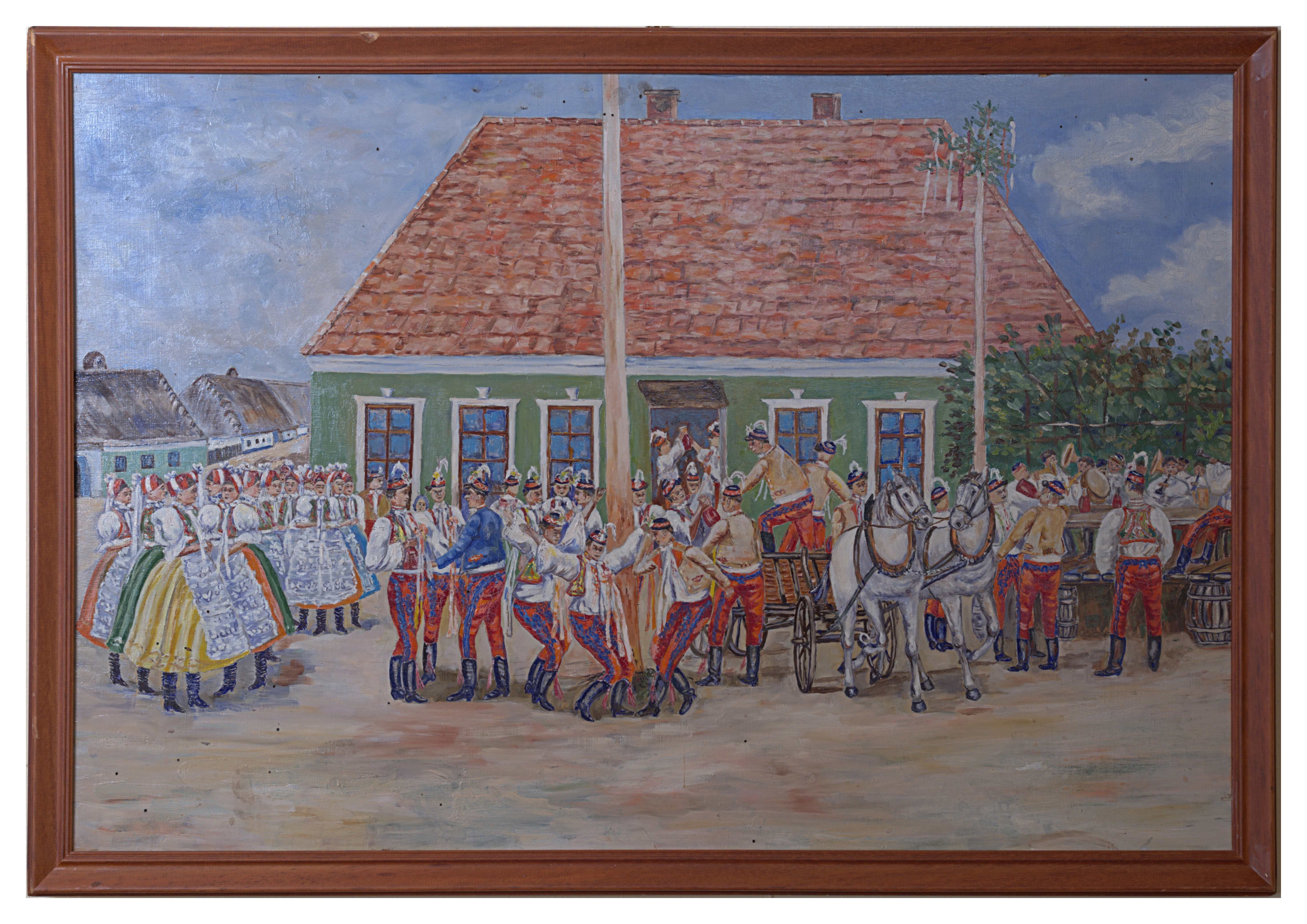 Hodový výjev na návsi ve Staré Břeclavi nás zavádí do dnes již neexistujícího světa tradiční lidové architektury (např. doškové chalupy). Pestrá paleta slavnostních krojů svobodné chasy „na vyslečení“, Část chlapců v bílém ratinovém kabátku „ratyňáku“ (vidíme i méně typickou variantu tmavě modrého) přijela tzv. přes pole jako hodoví hosté. Děvčata si ještě udržují klasickou siluetu díky původní délce svrchní sukně a způsobu jejího nabírání. Autor zachytil i starobřeclavský způsob modrého šňůrování u slavnostních soukenných kalhot „červenic“.