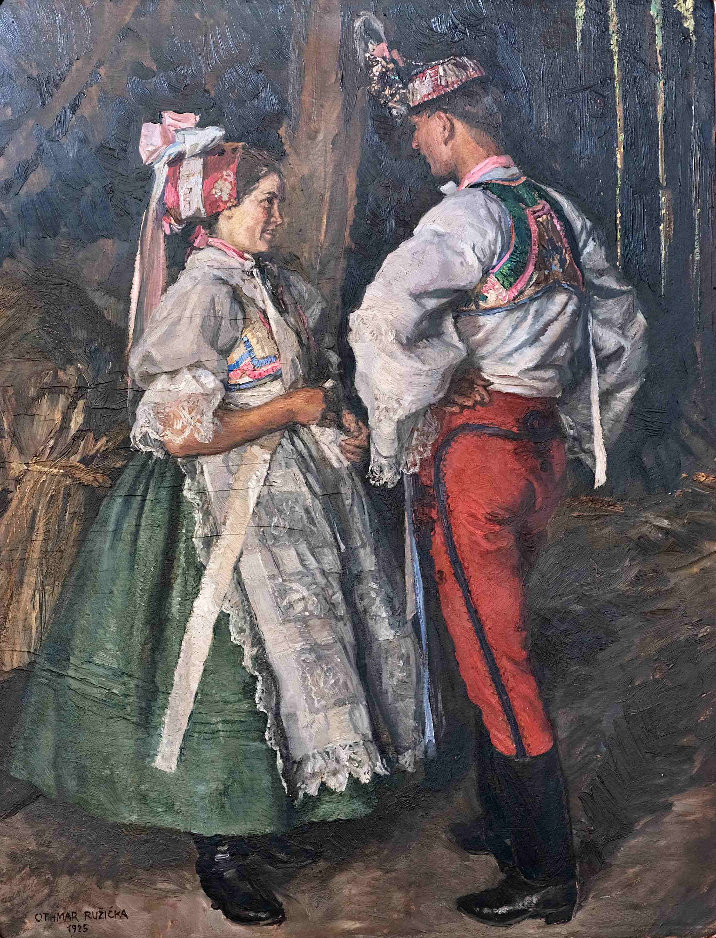 Obraz z roku 1925 věrným způsobem zachycuje půvab a honosnost slavnostního kroje (kroje „na vyslečení“) pro svobodné dívky a chlapce v západní (charvátské) části regionu Podluží. Jde o období, které ještě naplno odráží původní siluetu a proporce tohoto typu kroje bez pozdějších nevhodných úprav jakým bylo zkracování délky dívčích sukní, přebujelost výšivek či přehnané zdobení dívčích i chlapeckých vestiček bez rukávů „lajblů“.