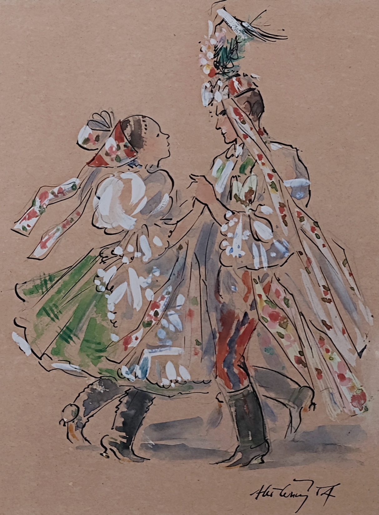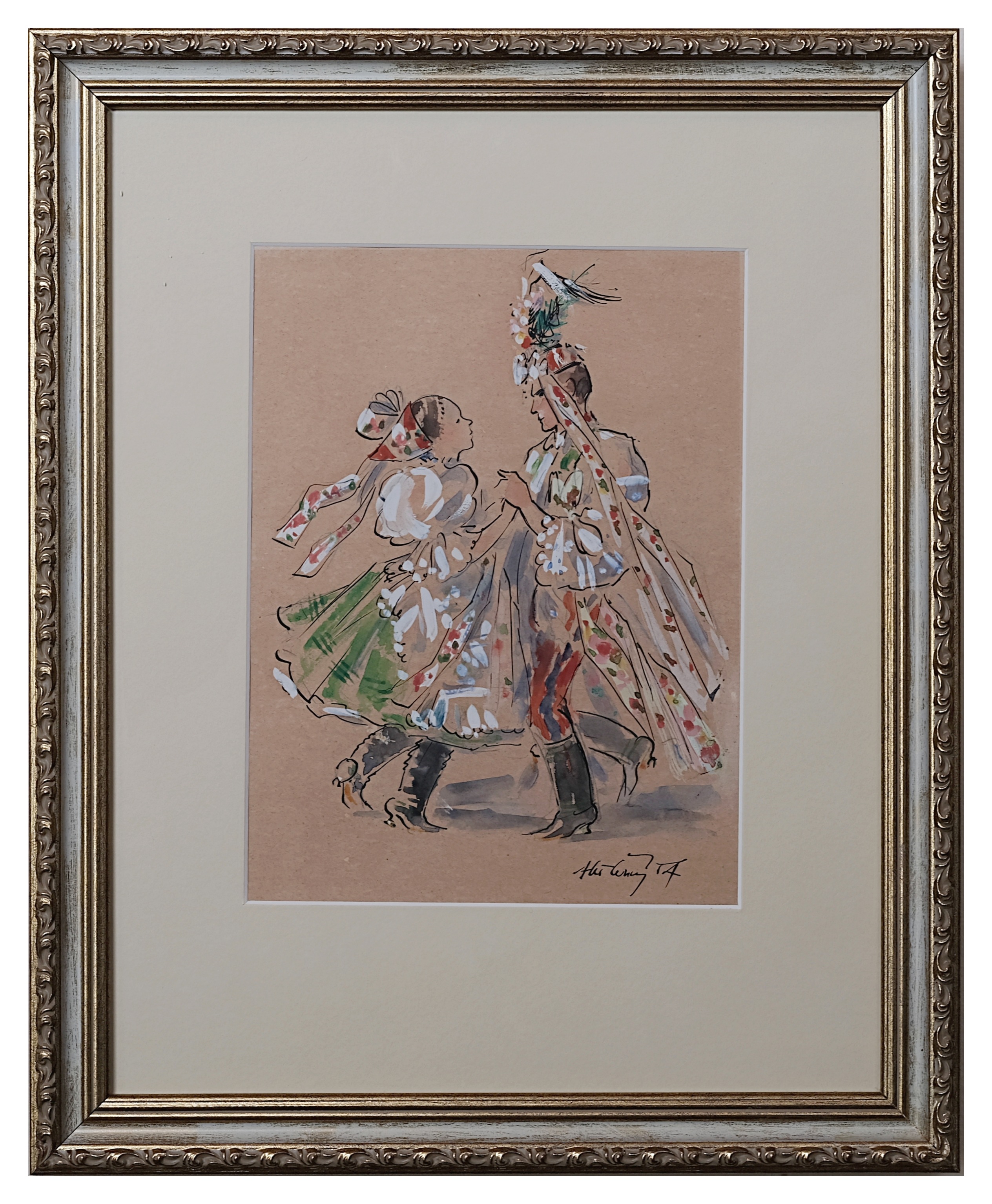 Nezaměnitelný autorův rukopis zachycuje krásu krojovaného svobodného páru v tanci z jižního Podluží – vyniká silueta, sladěnost barev i drobné detaily jako zlaté podkovičky na dívčích čižmách.