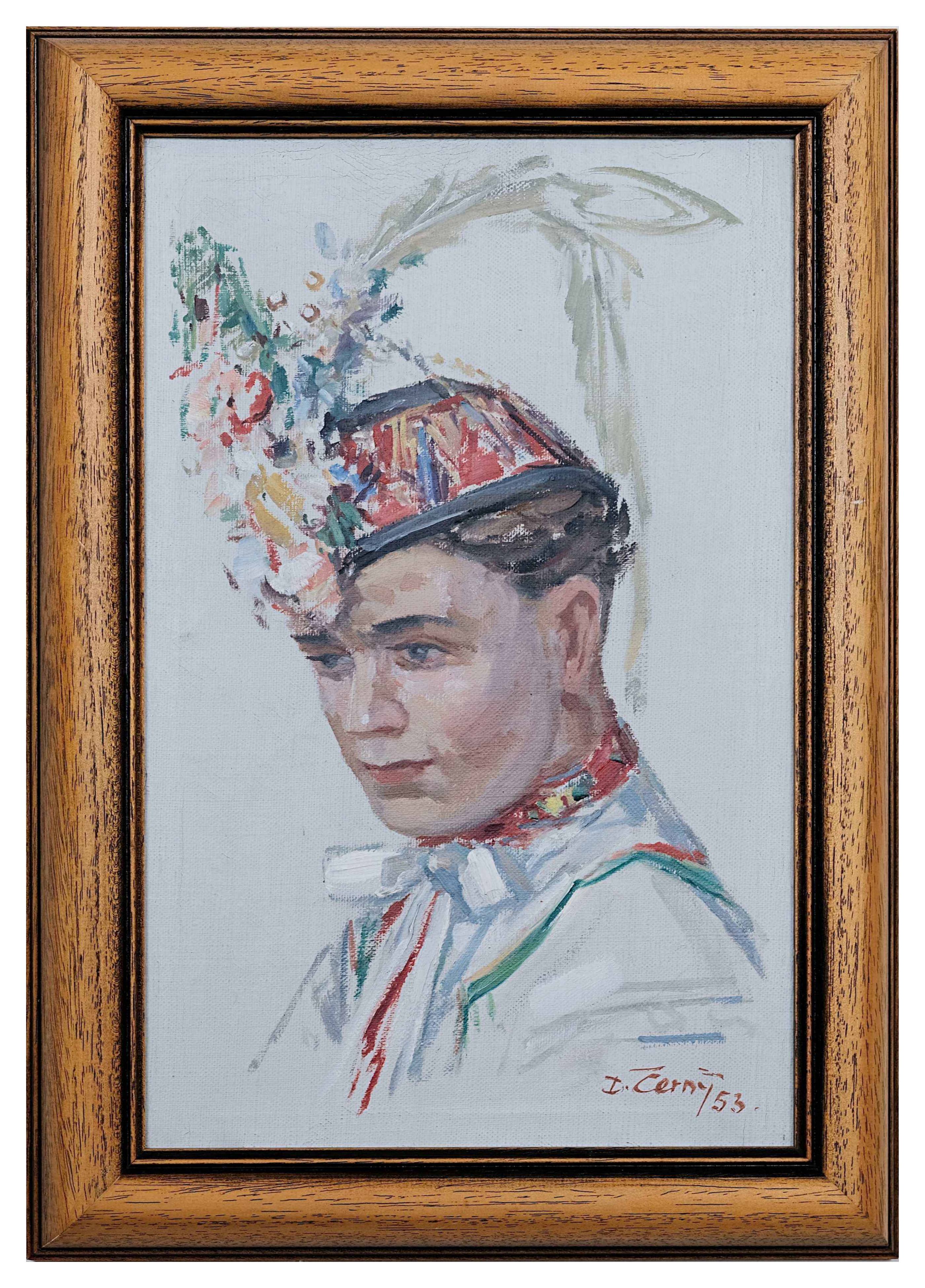 Velmi pěkná studie slavnostní pokrývky hlavy svobodných chlapců tzv. guláče či šmukáče. Tento typ kloboučku je dodnes nošený na západní (charvátské) a v několika obcích jižní části regionu Podluží.