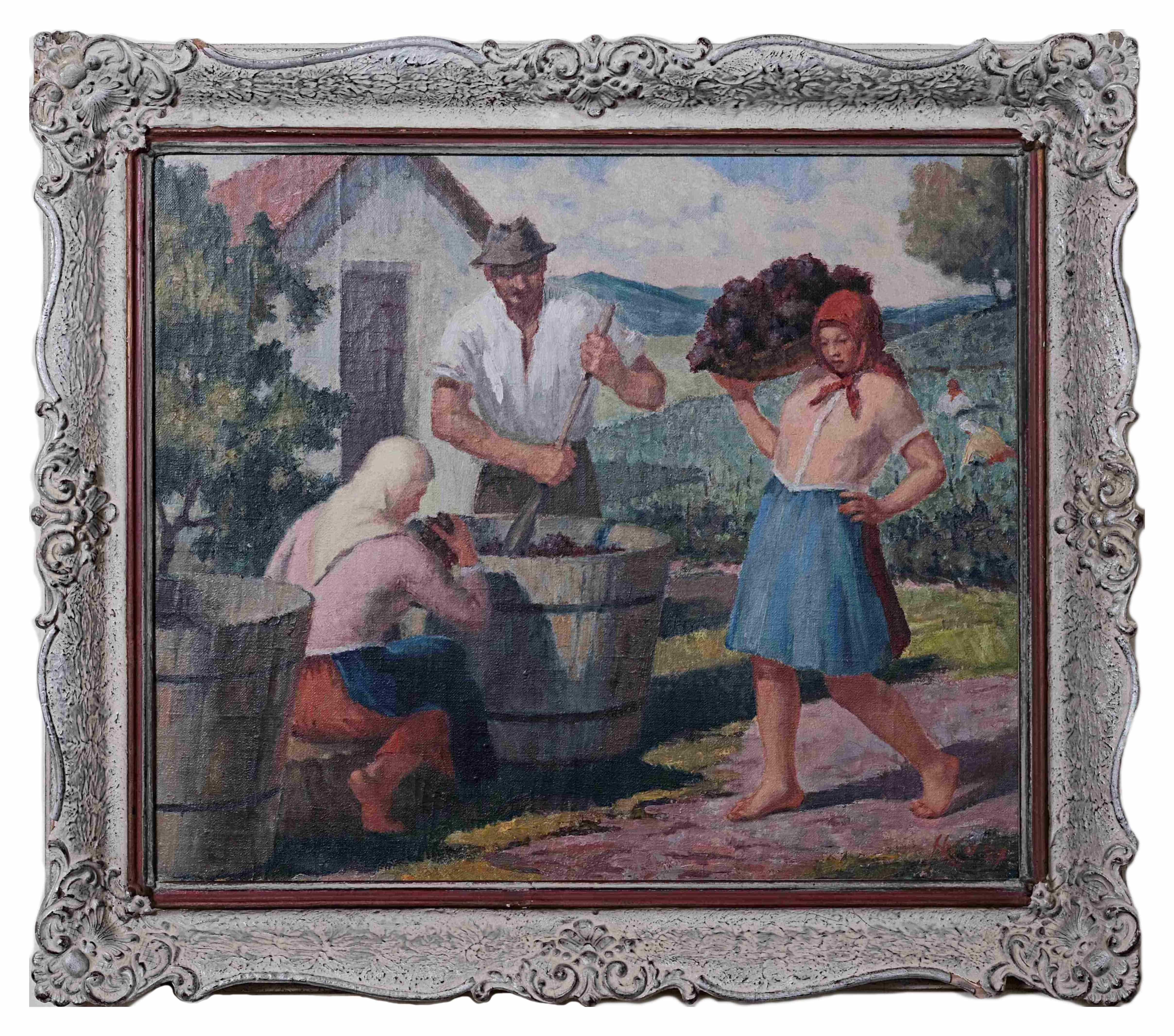 Pracovní kroj bývá výtvarně zachycen málokdy. Zde v pozadí s panoramou Bílých Karpat vidíme zpracování hroznů v některé z typických vinařských obcí jižního Podluží. Ženy jsou oblečeny v kratší sukni s pracovní modrou zástěrou, letní jupce s našitou jednoduchou kraječkou „parádou“ a nezbytném plátěném šátku. Ten je uvázán pod bradou na tzv. babu.