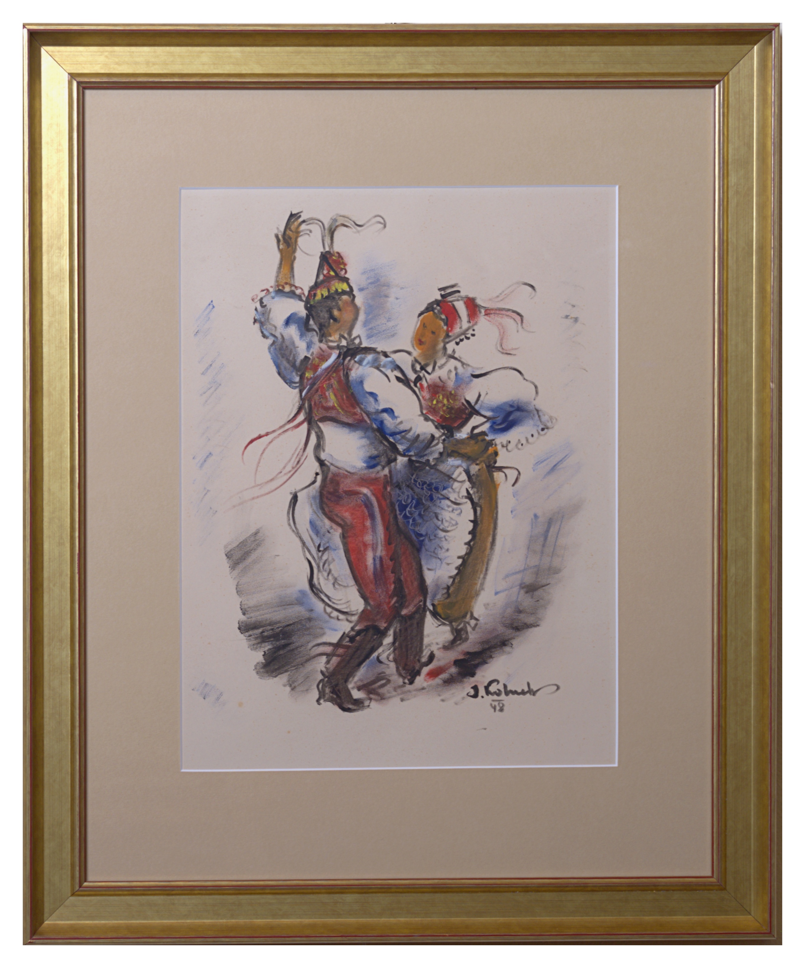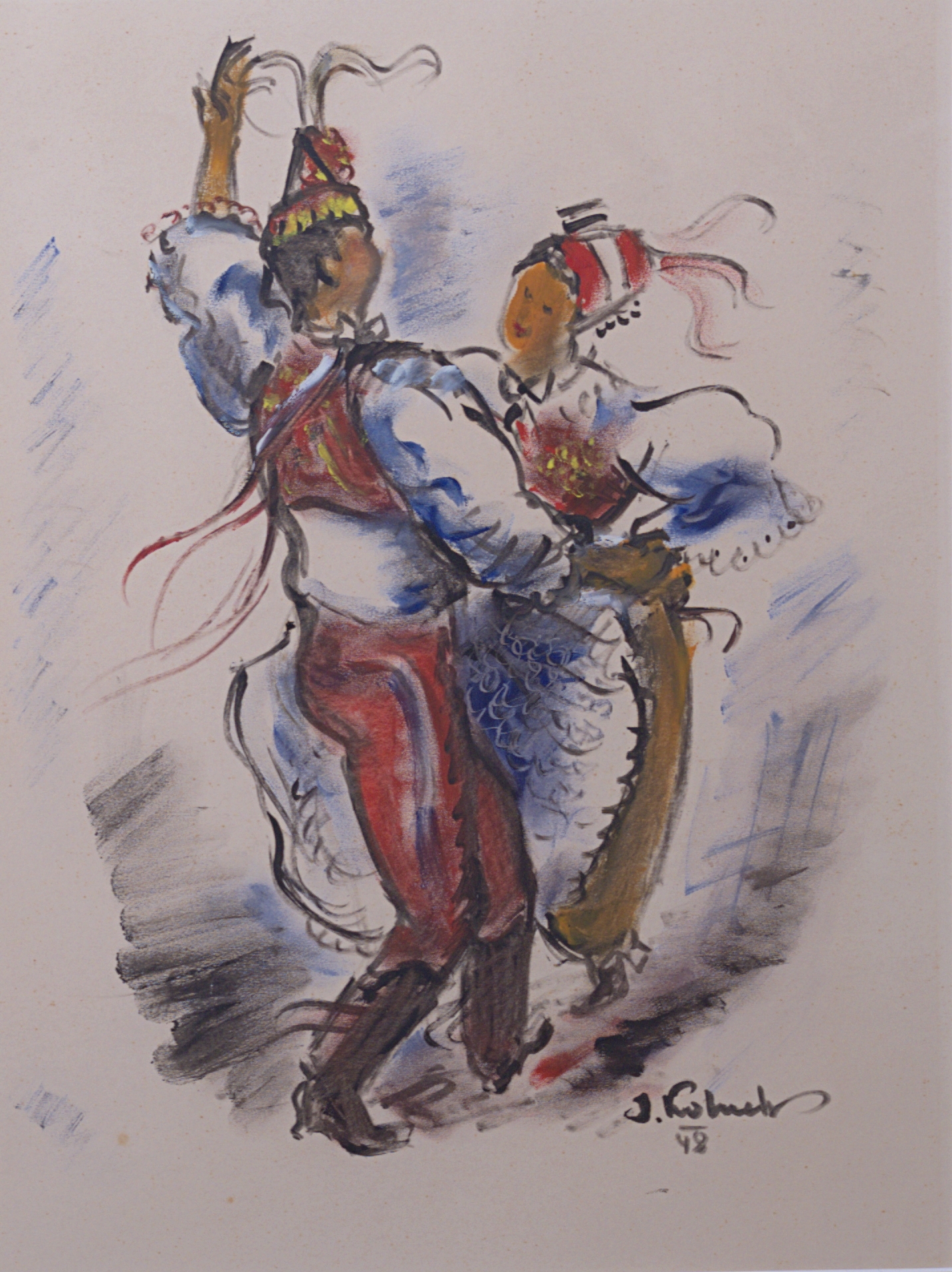 Tančící svobodný pár bychom dle dívčiny pokrývky hlavy „rožků“ a chlapcovy krátké vestičky „lajblu“ či „kordulky“ s červeným podkladem mohli lokalizovat do severnějších obcí regionu Podluží.
