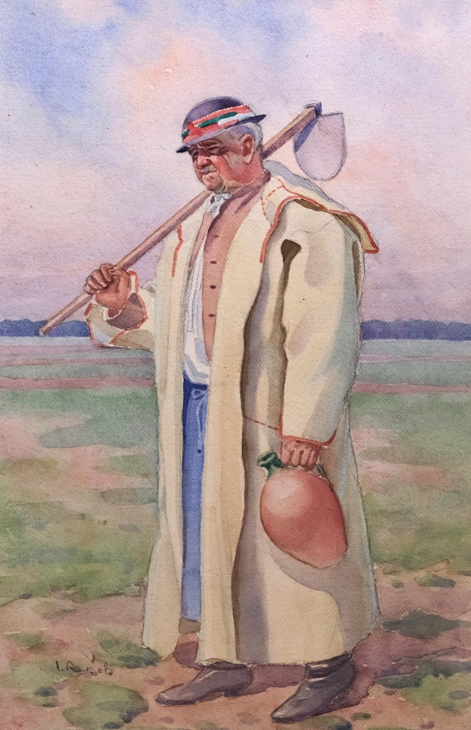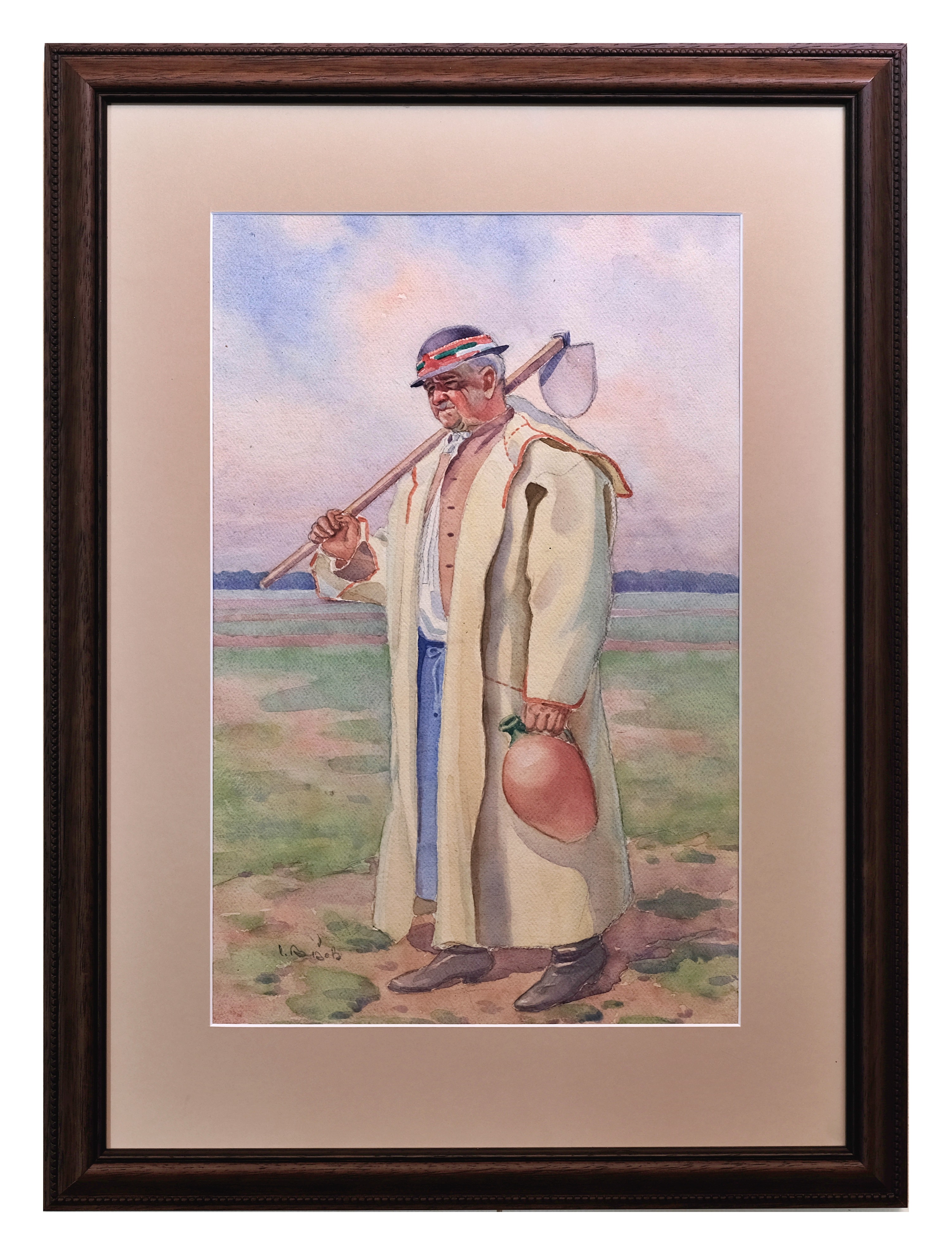 „Halina“ se oblékala pro běžné nošení v chladnějším počasí na základní pracovní kroj, který tvořily „vajskornová“ košile, „třaslavice“ a dlouhá modrá plátěná zástěra. Na akvarelu je zobrazeno i nošení kratšího pracovního kabátku „kabaně“. Velmi pěkně autor zachytil také dobovou variantu pokrývky hlavy – klobouk „húseňák“ pro starší mužáky s kratší stříškou stočenou nahoru. Tato dnes již zaniklá starobřeclavská varianta měla barevné žinylky („húsenky“) obtočené nad sebou, na rozdíl od propletených v okolních obcích Podluží.