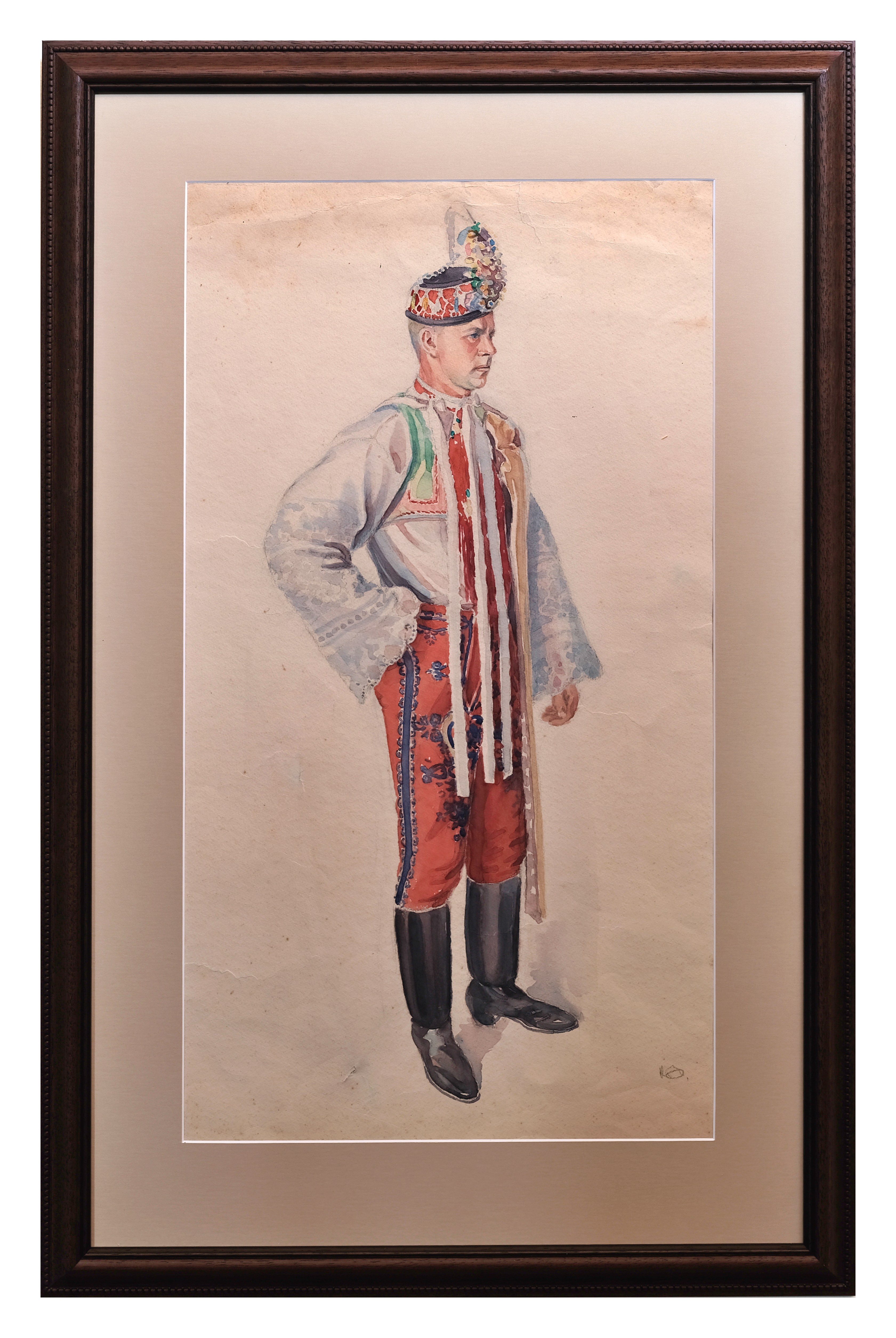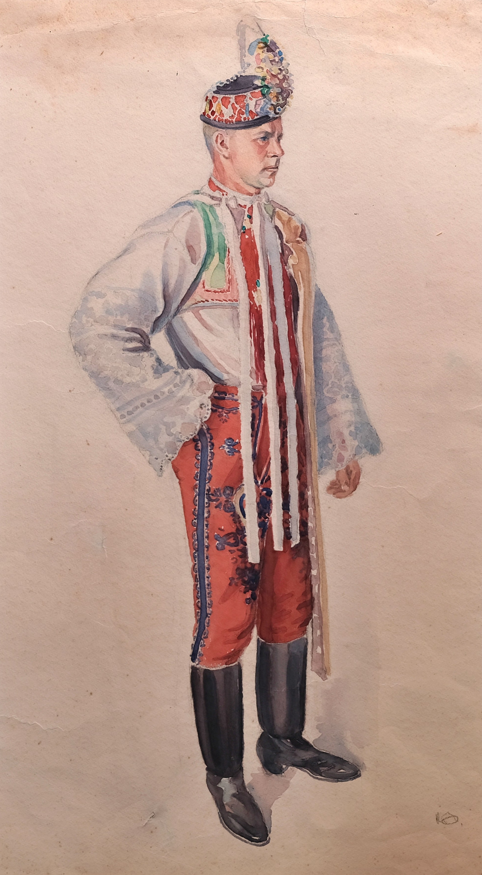 Akvarel mládence ve slavnostním kroji „na vyslečení“ doplňuje akvarel dívky a obě autorova díla nám dávají detailní představu lidového oděvu svobodné chasy v končící době autentického folkloru.