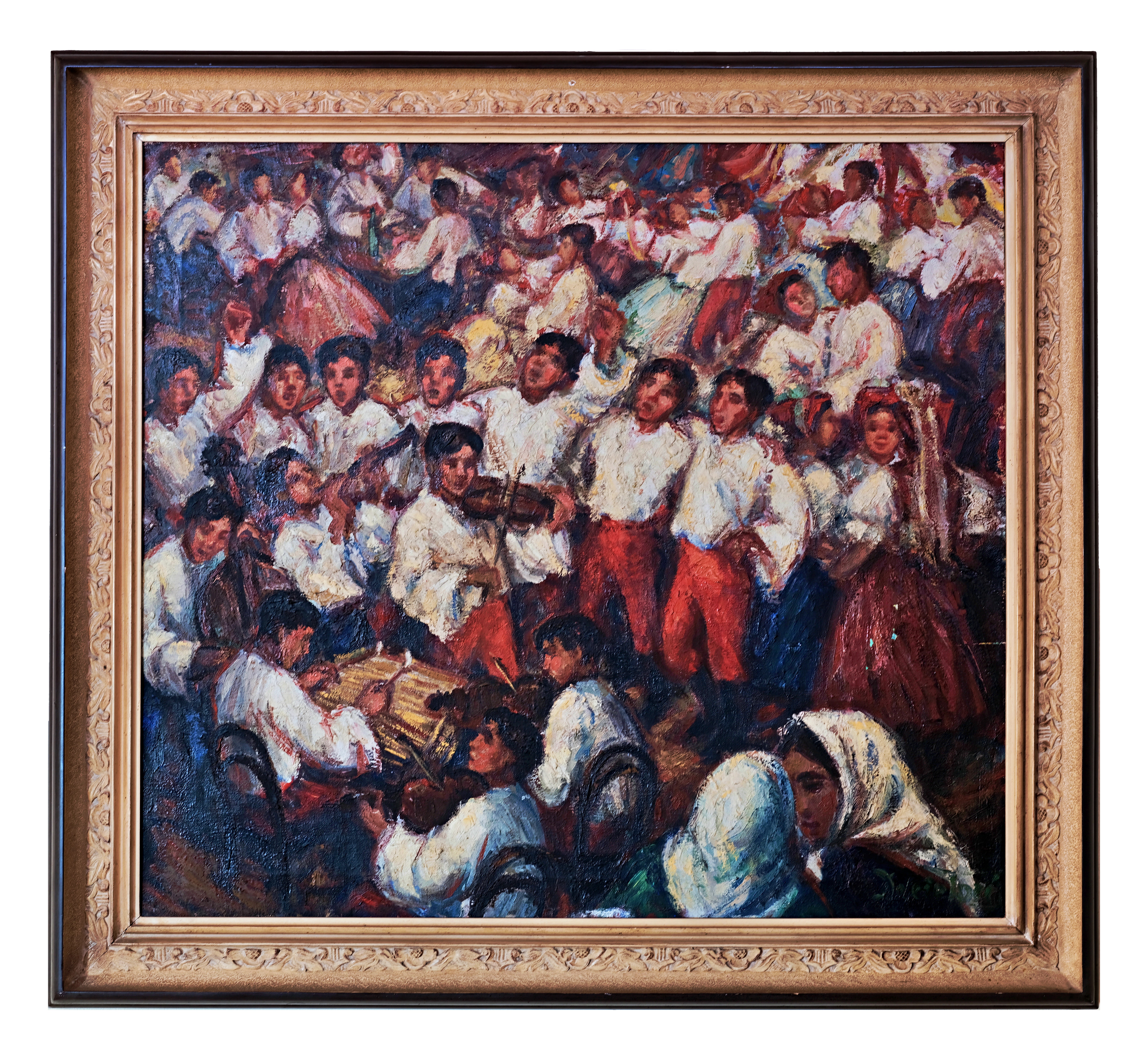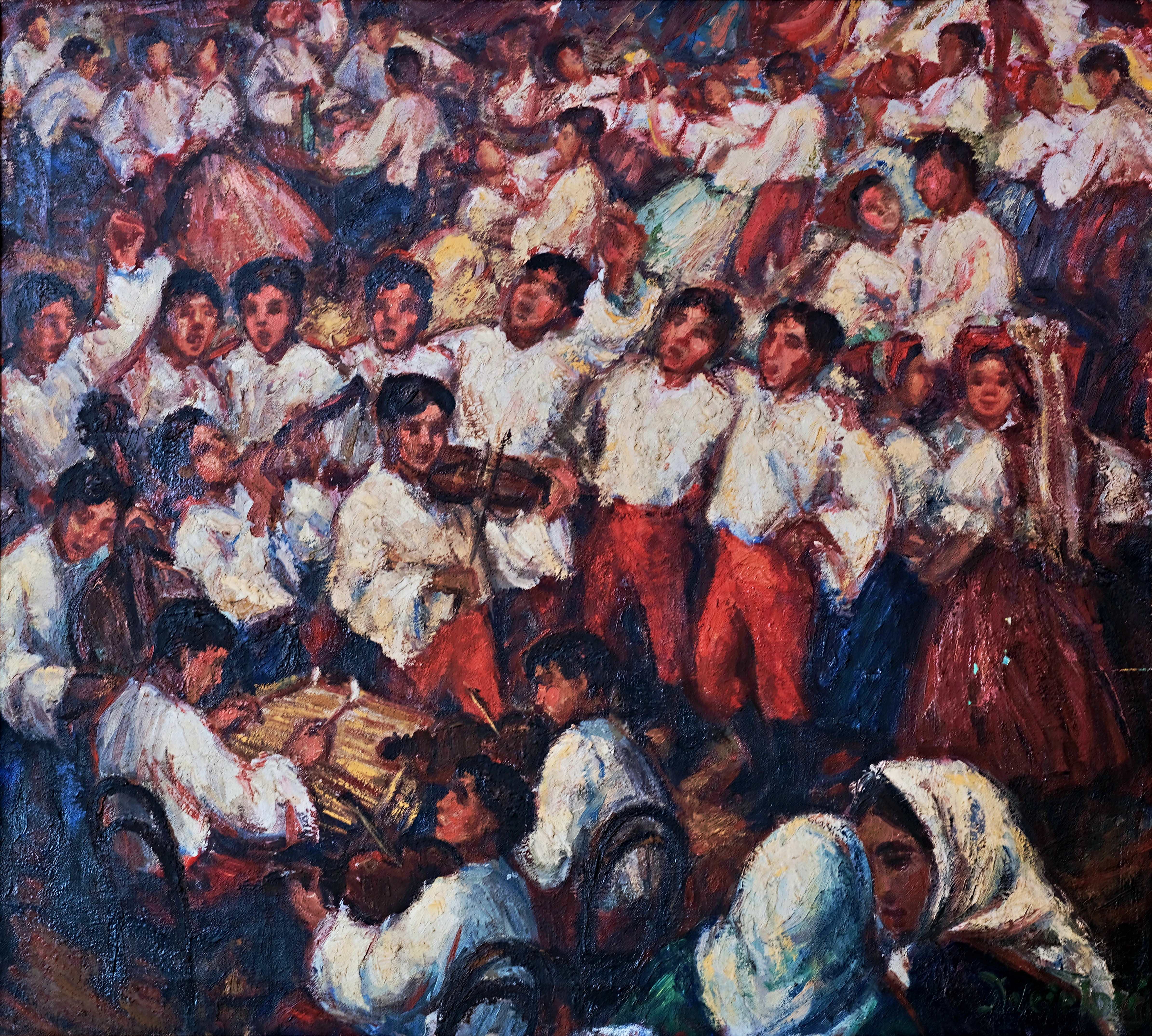 Míla Doleželová (1922-1993) - Narodila se 12. listopadu 1922 v Prostějově. Ve čtrnácti letech odešla do učení na dámskou kloboučnici. Poté pracovala v Prostějově a v Plzni, kde u své tety přežila válku. V roce 1945 začala navštěvovat Státní grafickou školu v Praze, té však po roce studia zanechala. V roce 1946 byla přijata do druhého ročníku grafického ateliéru AVU vedeného Vladimírem Puklem. Ke studiu jí byl udělen dispens, který jí z důvodu výrazného nadání povoloval studium navzdory tomu, že neměla maturitu. Studia dokončila v roce 1950 a následující čtyři roky na AVU působila jako odborná asistentka. Od roku 1954 se věnovala především olejomalbě, roku 1957 pak podnikla na východním Slovensku etnografické bádání o životě Romů. Z AVU na vlastní žádost odešla a od roku 1957 společně s matkou a manželem Jiřím Marešem žila v bývalé cihelně u obce Jihlávka. V roce 1961 se všichni přestěhovali do malé vesničky Klatovec nedaleko Javořice, v centrální části Vysočiny. V tomto období se celá rodina potýkala s velkými materiálními problémy. Třebaže ale v domě nebyla zavedena ani voda, ani elektřina, Doleželová se v samotě Vysočiny našla a v tomto období vytvořila největší množství olejomaleb a kreseb. V 50. a 60. letech byly se ústředním tématem její tvorby Romové. V téže době také uspořádala své první výstavy. Zlom nastal po její souborné výstavě v Galerii Vysočiny v Jihlavě (1966), kam zavítal mexický obchodník s obrazy a prakticky celou výstavu skoupil. V roce 1967 též prodala 25 obrazů do USA. Následovaly její výstavy v Miami na Floridě (1967), v Chicagu (1969) a Mexiku (1971). V roce 1967 vstoupila do Sdružení výtvarných umělců Vysočiny. V roce 1972 koupila s manželem dům v Telči. V této době se Doleželová zaměřila na náboženská témata. V Telči tvořila až do své smrti. Poslední léta však trávila v naprostém osamění: v roce 1978 jí zemřela matka a v lednu 1984 její manžel. Jeho smrt Doleželovou silně zasáhla, na několik měsíců přestala tvořit a uzavřela se před lidmi. Zemřela sama 30. prosince 1993. V díle se Doleželová inspirovala byzantskými ikonami a orientálním uměním (odtud přezdívka „malířka velkých očí“). Hlavními tématy jí byli Romové, u nichž nacházela zdroj prostého a čistého života. Po smrti jejích blízkých do popředí vystoupily náboženské motivy: především novozákonní. Pozůstalost autorky čítá téměř 2000 prací (kresby, malby, fresky, knižní ilustrace). Obraz „Podlužácká chasa u cimbálu“ byl pravděpodobně namalován v Lužicích v rámci cyklu Národní tance. V roce 1953 zde autorka pro Československé naftové závody tvořila cyklus Naftaři. Za povšimnutí stojí i fakt, že toto své dílo Doleželová ještě opatřila svojí signaturou. V následujícím období s příklonem k novému typickému rysu malby tuto praxi zcel opouští.