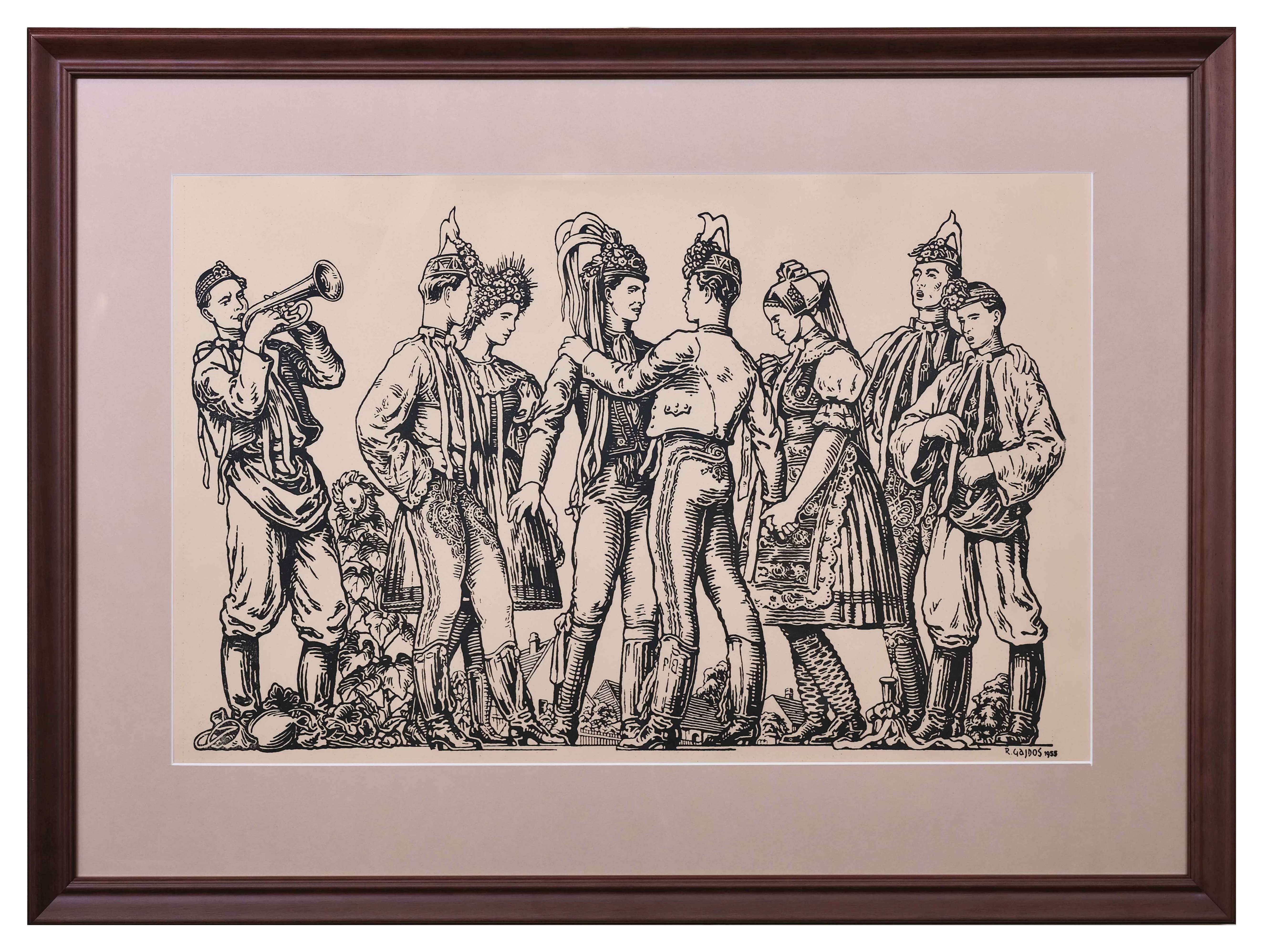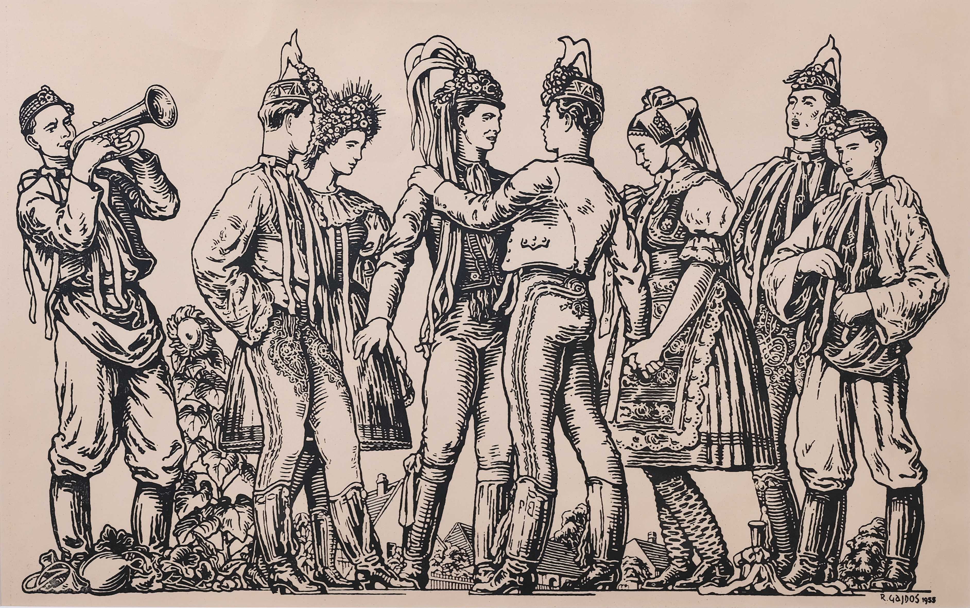 Auror na dřevorytu zachycuje soudobé varianty slavnostního kroje pro svobodné – domácí chlapci z jižního Podluží v „kroji na vyslečení“ či v bílém kabátku „ratyňáku“, hudebníci v „třaslavicích“ s modrou zástěrou a kloboučkem „húseňákem“. Slavnostní kroj přespolního páru bychom mohli potom zařadit do národopisného regionu Hanácké Slovácko.