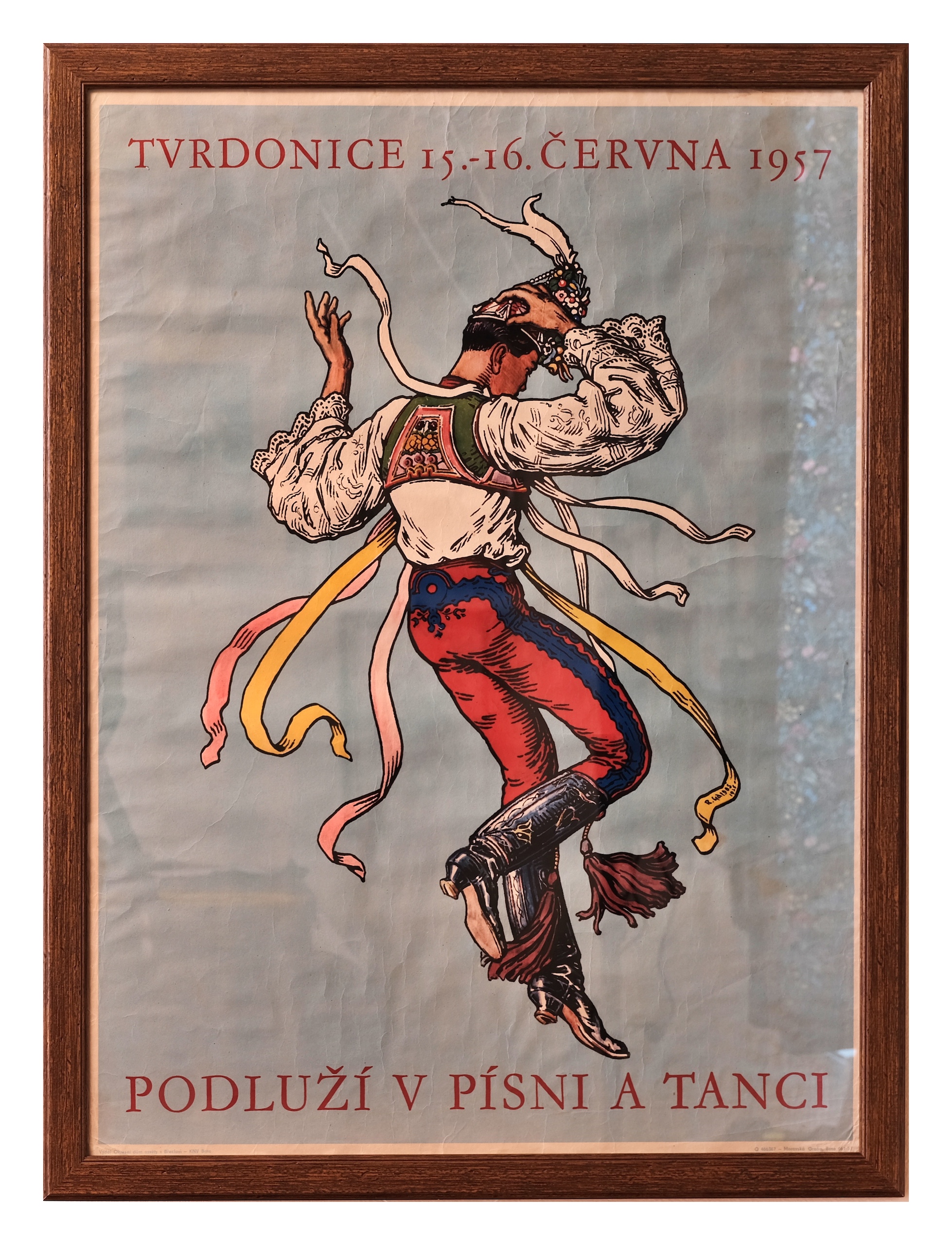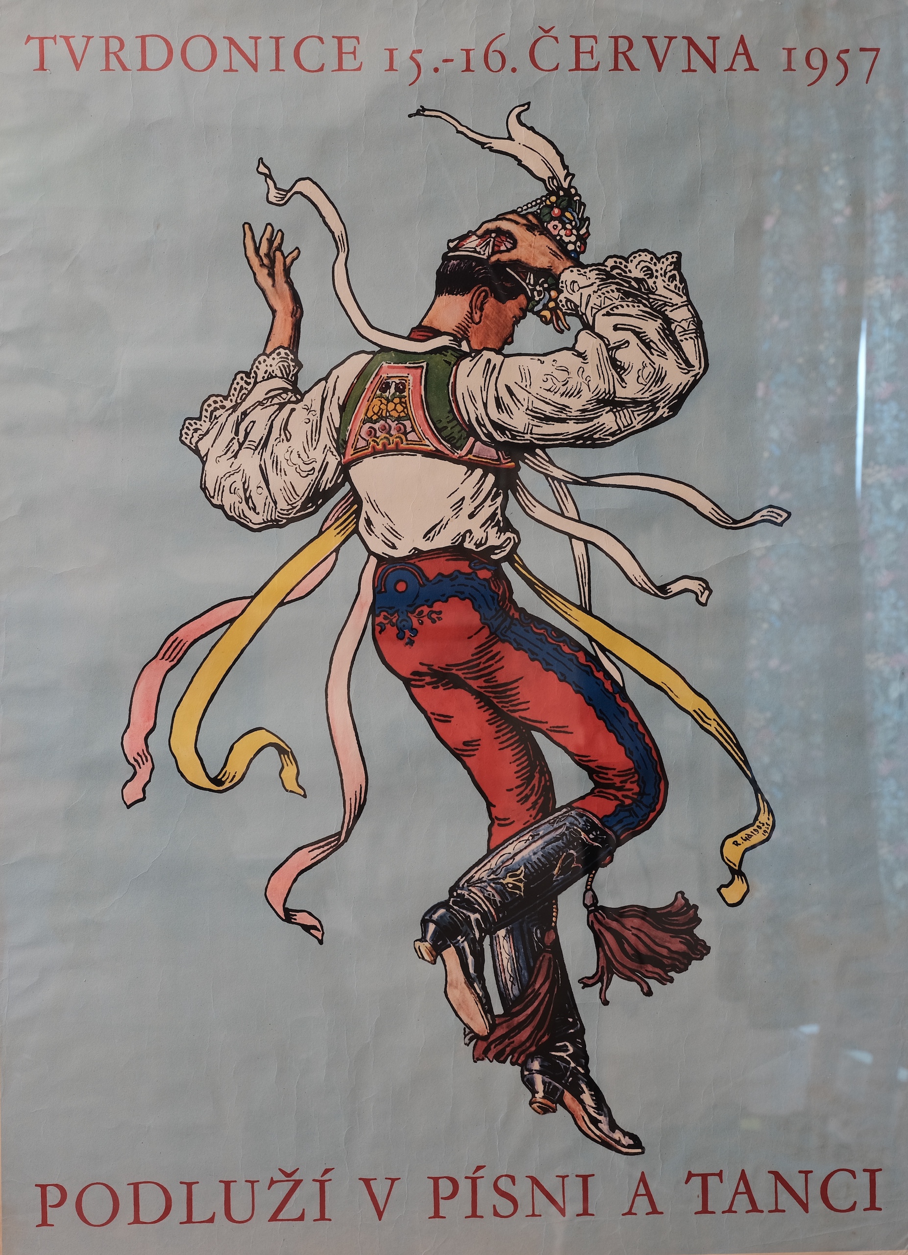 Velmi zdařilé zachycení siluety a barevného složení kroje na „vyslečení“ pro svobodného mládence z jižního Podluží. Nejvýraznějším prvkem jsou červené soukenné nohavice „červenice“ s bohatě vyšívaným modrým šňůrováním, doplněné drobnou modrou výšivkou „cifrováním“.