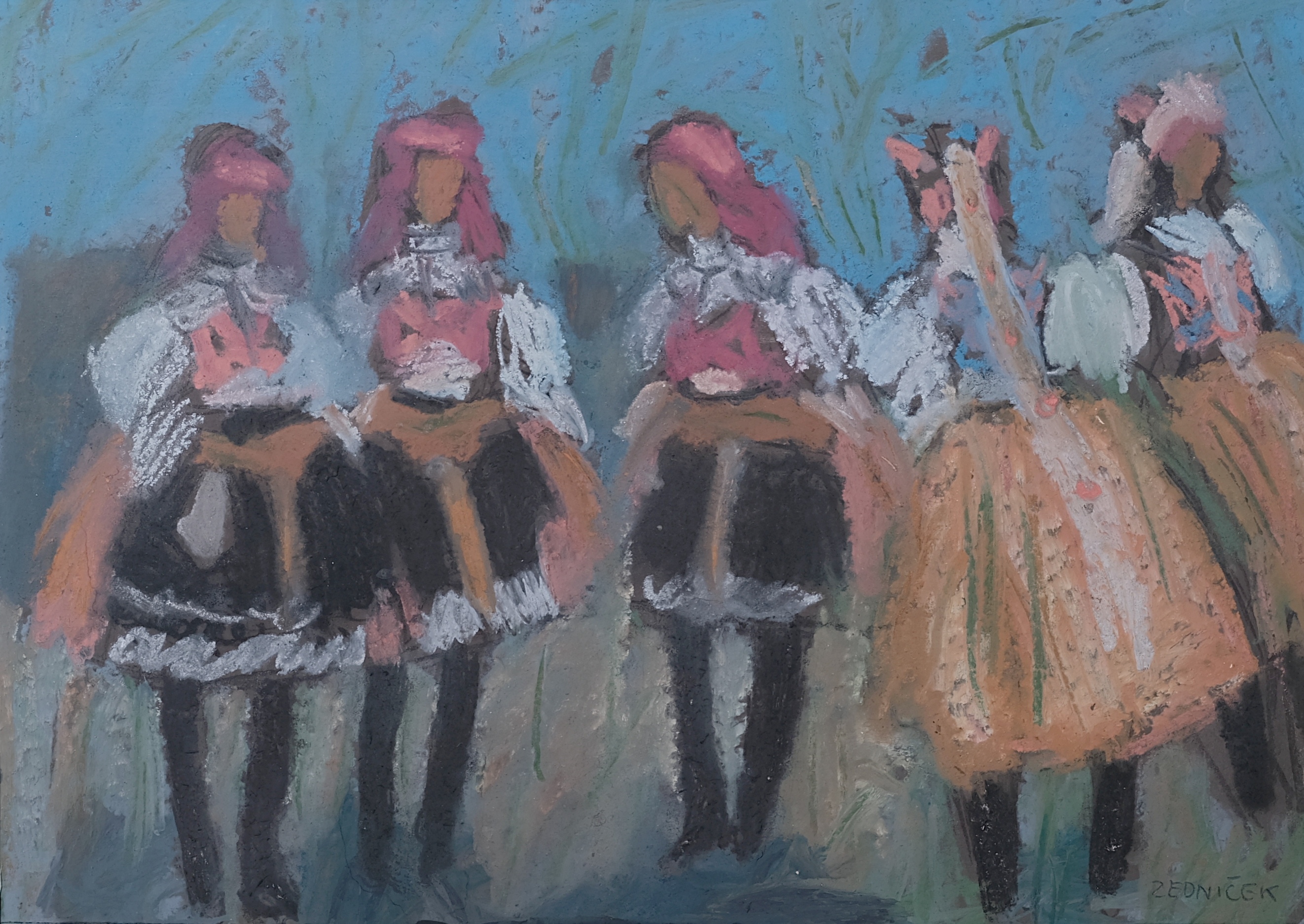 Jak bohatá a rozmanitá může být národopisná oblast Slovácko. Kontrast krátkých sukní a tureckých šátků z Dolňácka a podlužácká linie pastelových svrchních sukní s až šesti spodničkami a pokrývkou hlavy „rožkami“.