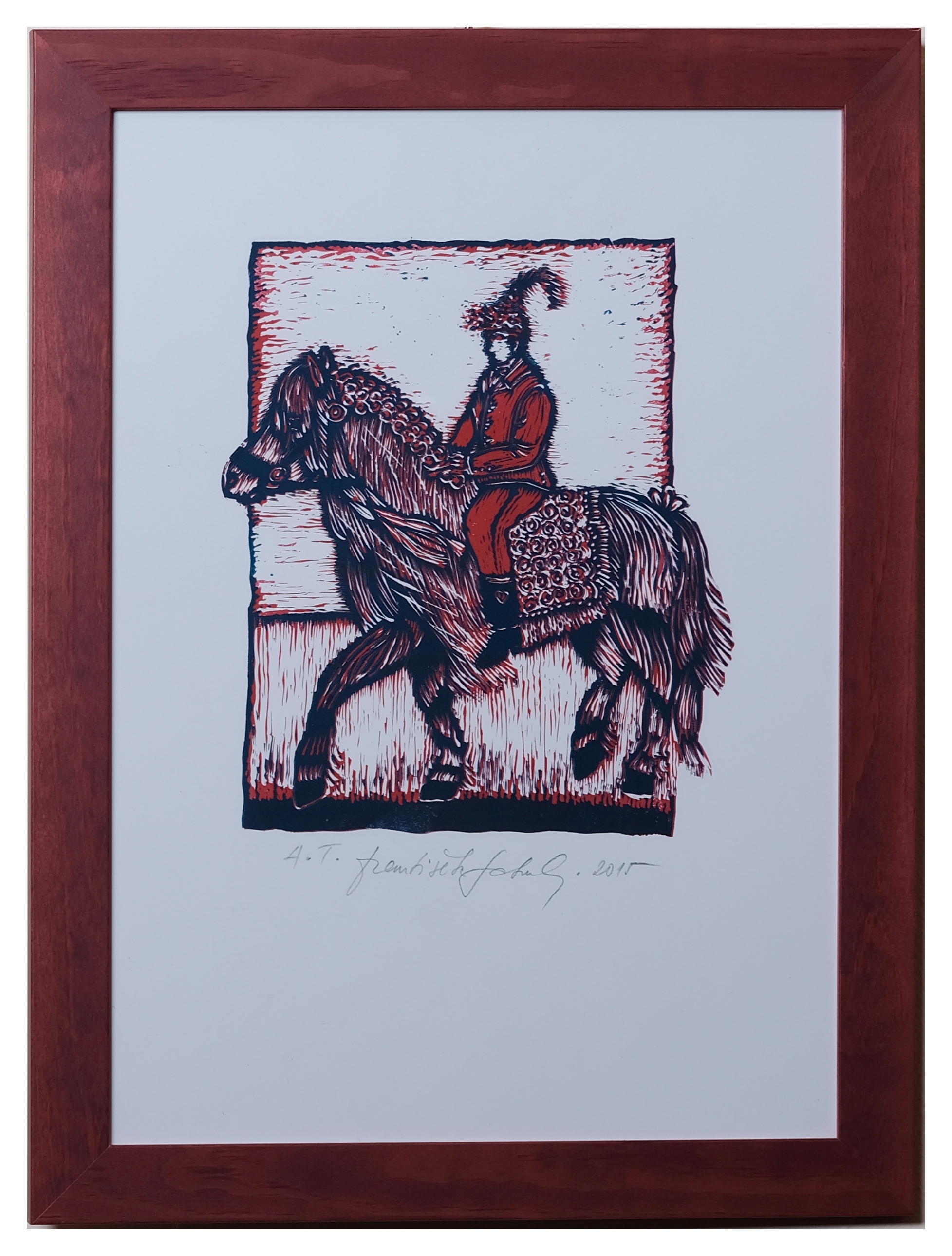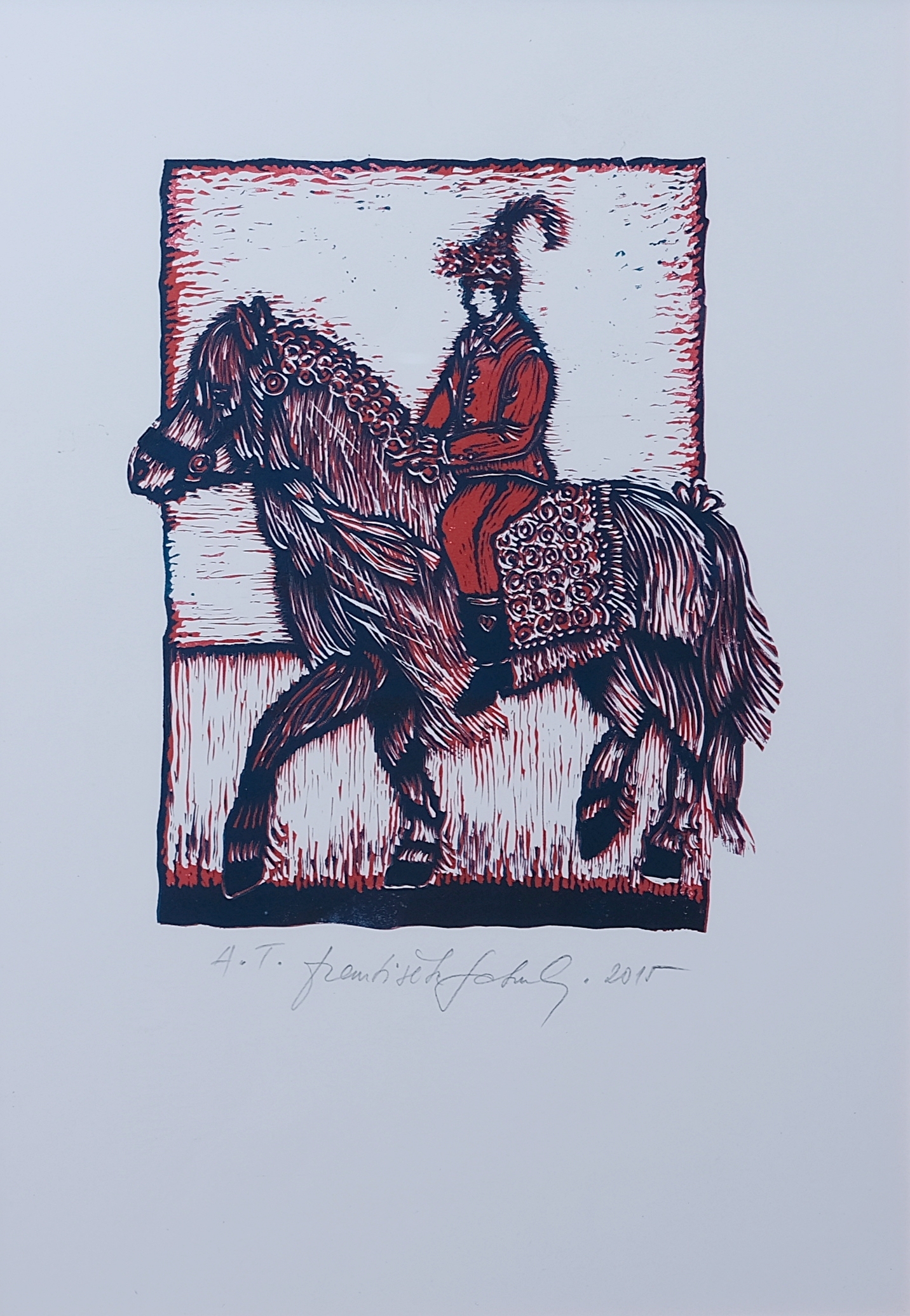 V obci, v sedláckých rodinách, se také dlouho udržovala tradice jízdy na slavnostně okrášlených koních. A tak autorův linoryt znovu připomíná, že chlapecký soukenný komplet našel svůj vzor v oslnivých uniformách uherských husarů.