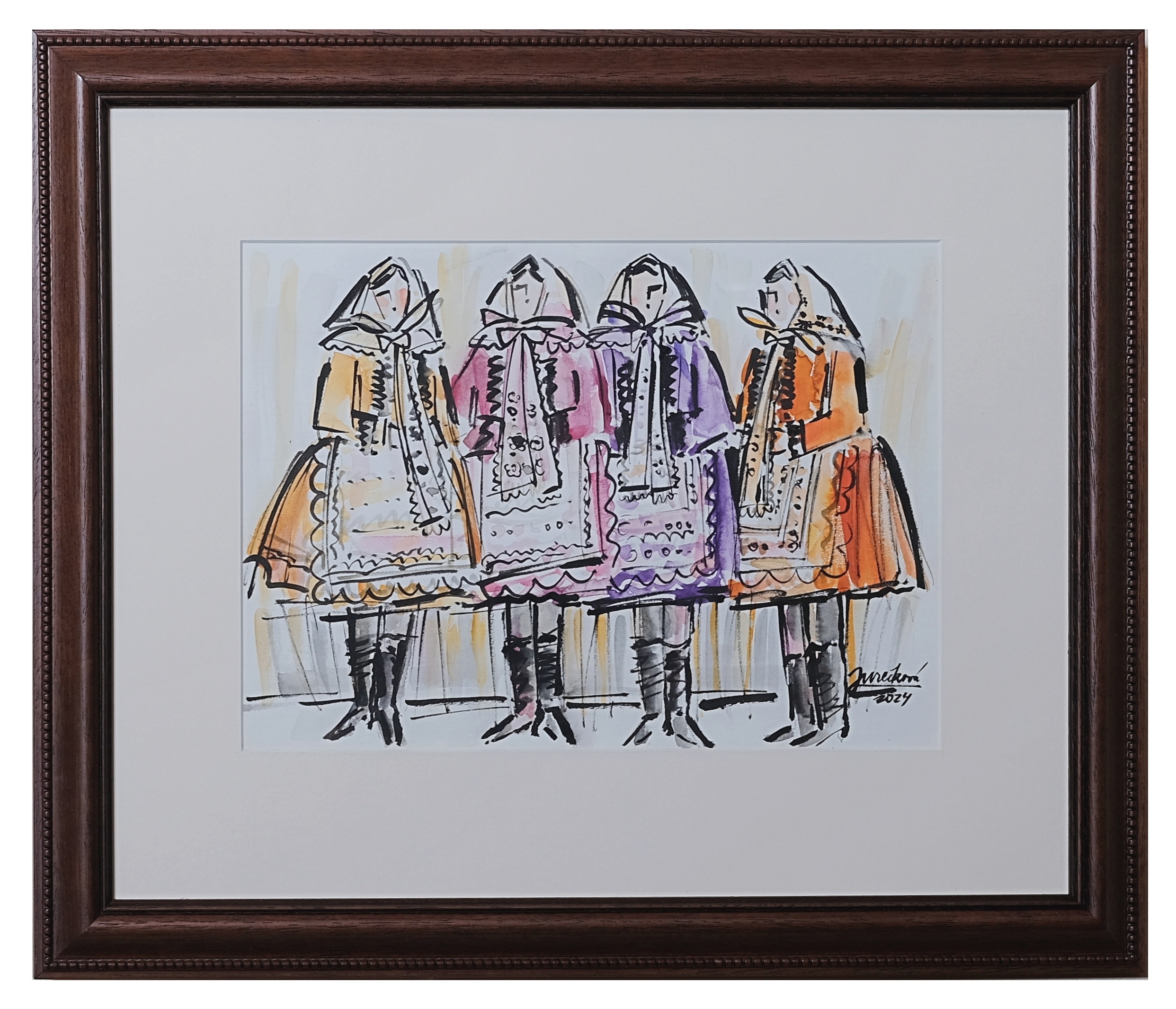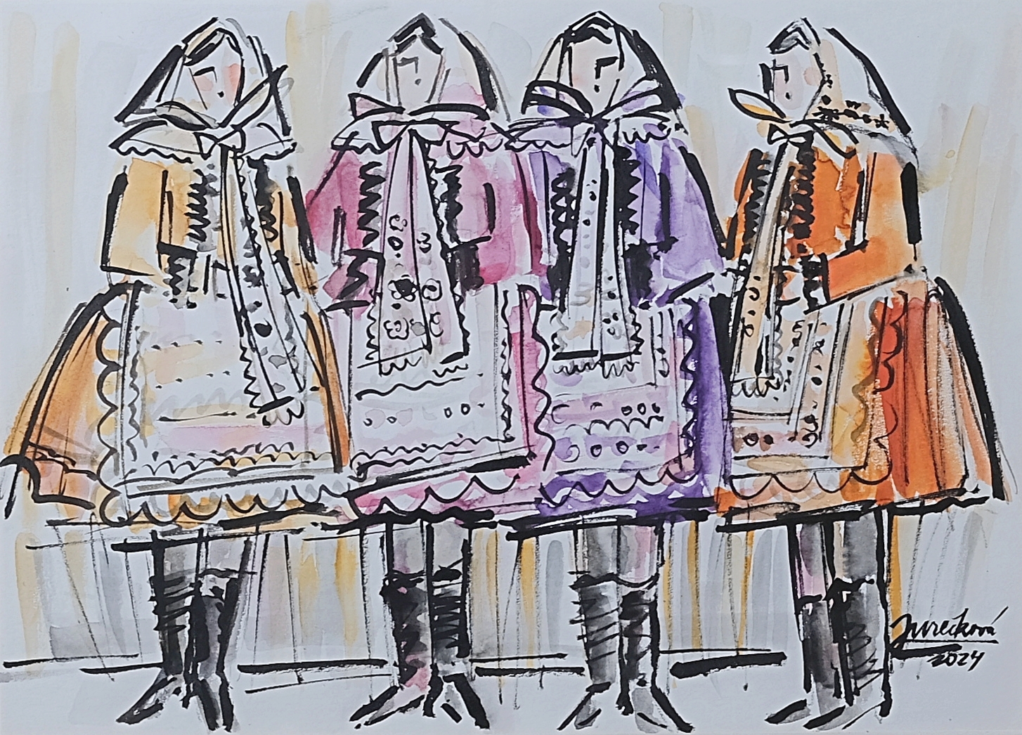 Akvarel vzdává hold skupině žen vracející podlužácký kroj zpátky do Lednice. Obnovené nošení krojů NaKrojenými Ledničankami napomohlo znovu zařadit obec do národopisné mapy regionu a také připomenout, že právě z Lednice (a to od jejího rodáka Josefa Aloise Zemana) pochází první popis podlužáckého kroje. Je z roku 1811 a je psán v německém jazyce. Lednice svým postavením jako centrum jihomoravských lichtenštejnských statků se podepsala na ústupu tradiční lidové kultury již v druhé polovině 19. století. Nastává postupná industrializace, odkládání lidového oděvu jako projevu jinakosti, přijímání německého jazyka při sílícím germanizačním tlaku. A situace se nelepší ani po celé dramatické 20. století.Teprve 21. století přináší novou šanci na pevné kontinuální pokračování obnovy lidového kroje a zvykosloví. Ženy na akvarelu jsou hrdými nositelkami slavnostního lidového oděvu pro vdané ženy, kterými jsou tzv. šaty – jupka a sukně stejné látky, doplněné bíle vyšívanou zástěrou, obojkem, šňůrkami, vysokými čižmami a nezbytným hedvábným či brokátovým šátkem.
