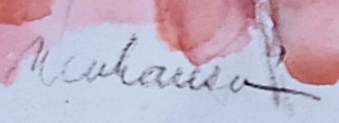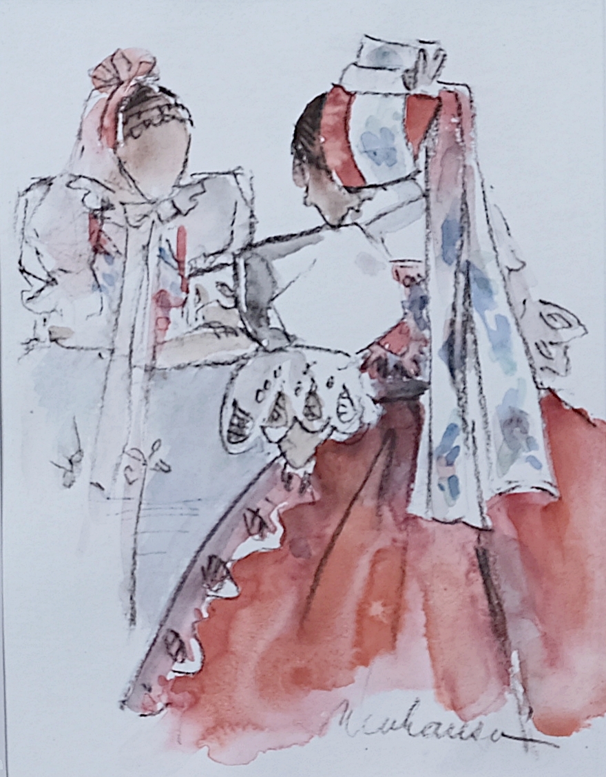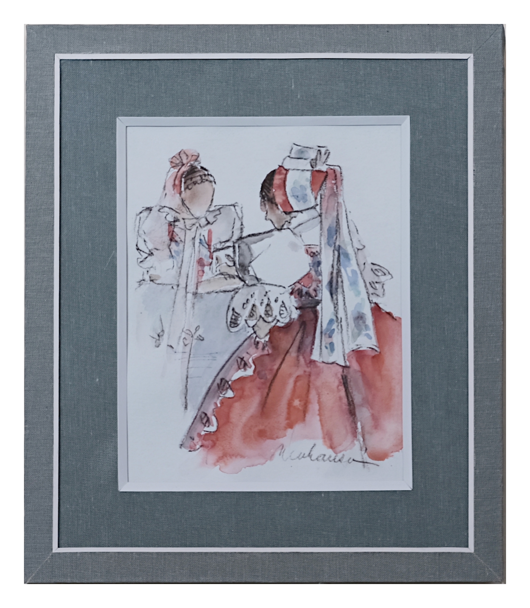 Zajímavý akvarel děvčat ve slavnostním kroji „na vyslečení“. Opět pokrývka hlavy „rožky“ indikuje jižní či severní část Podluží.