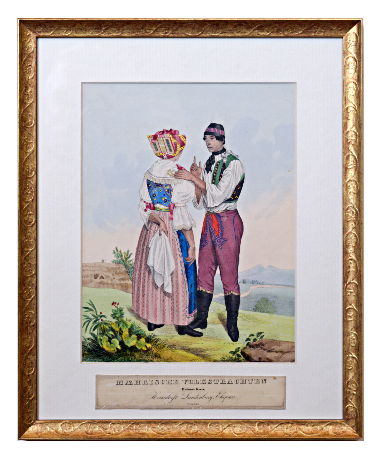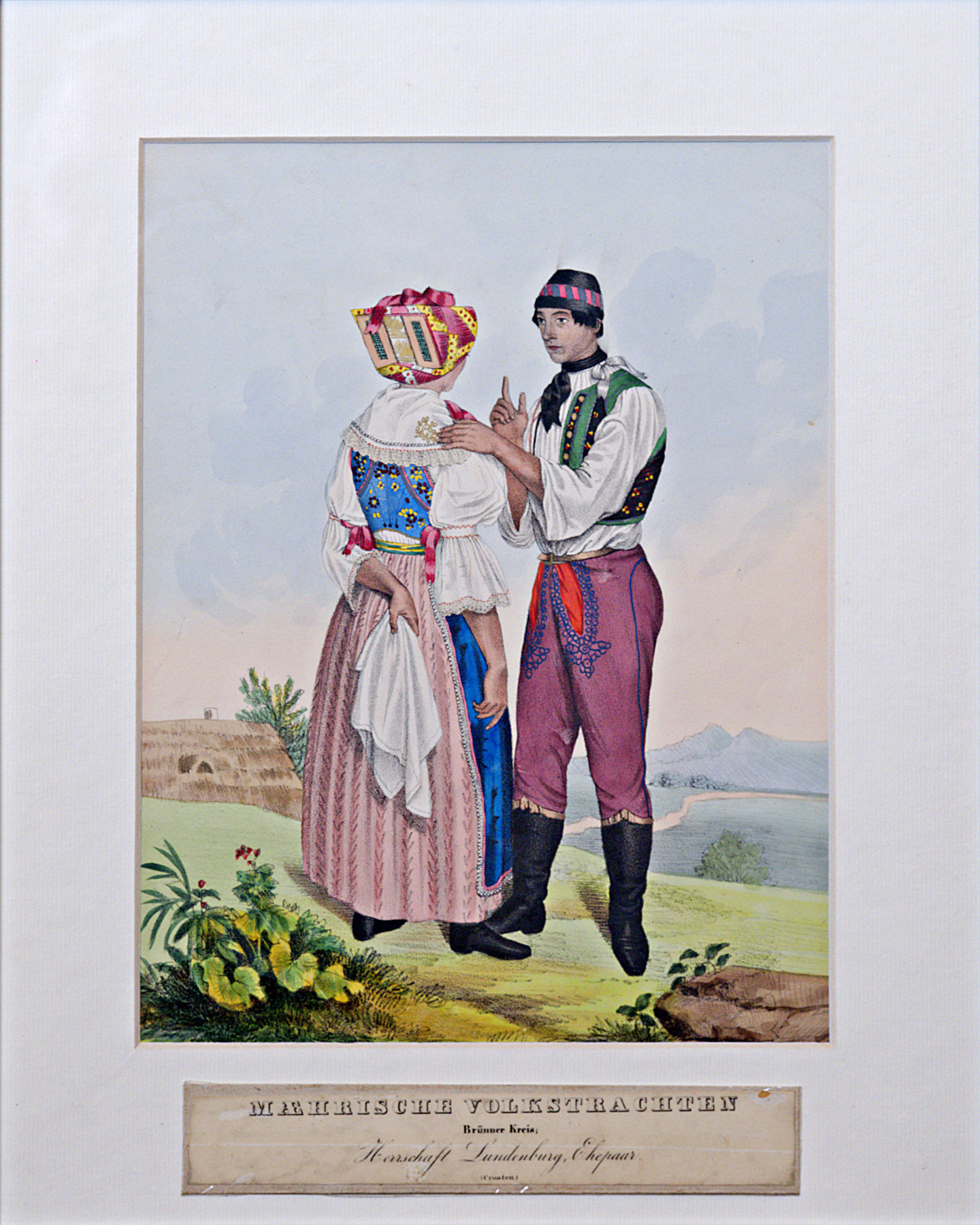 Mladý manželský pár ve slavnostním kroji na druhém nejstarším vyobrazení podlužáckého kroje. Ženáč má ještě vysoký černý klobouk s bíločerveným olemováním, ale již bez pera a „kosírku“ (jak se v jeho manželském stavu patří a sluší). Krátká vesta bez rukávů „lajbl“ se velmi pomalu přibližuje k typickému pozdějšímu střihu a tmavý květovaný podklad je vyložen zelenými vložkami. Krátký tmavý šátek s drobnými kvítky uvázaný kolem krku bude napříště znamením ženatého muže. Kroj doplňují bílá košile se širokými, ale kratšími rukávy bez výšivky a krajky a těsně přiléhající soukenné nohavice fialové barvy. Ty jsou již zdobeny modrým „šňůrováním“. Vysoké černé boty s nízkým podpatkem jsou v horní části vykrojeny do špice nahoru.